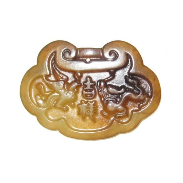 An auspicious Chinese yellow jade pendant decorated with dragon and phoenix carvings and characters meaning good fortune. This Chinese yellow jade pendant is of the shape of a traditional Chinese lock, which symbolically means that it can lock your good fortune safely and keep you away from dangers. The dragon and phoenix pattern and the carved Chinese characters are all classical symbols of good luck and fortune.