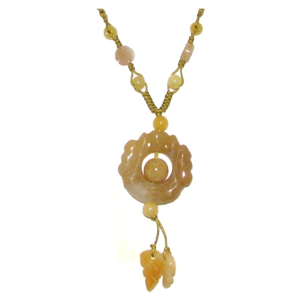 The Chinese double dragon honey jade necklace is a fine piece of artwork. It was made of many pieces of jade tied onto the Chinese necklace cord, the design is a traditional Chinese style. Wearing this, the jade double dragons can release their powers to protect the wearer from harm.