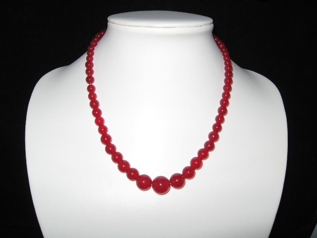 This is a magnificent Chinese necklace, made up of well-polished and radiant scarlet jade beads of different sizes. The biggest one is in the center. Wear this elegant Chinese necklace and show your noble taste and sense of fashion.